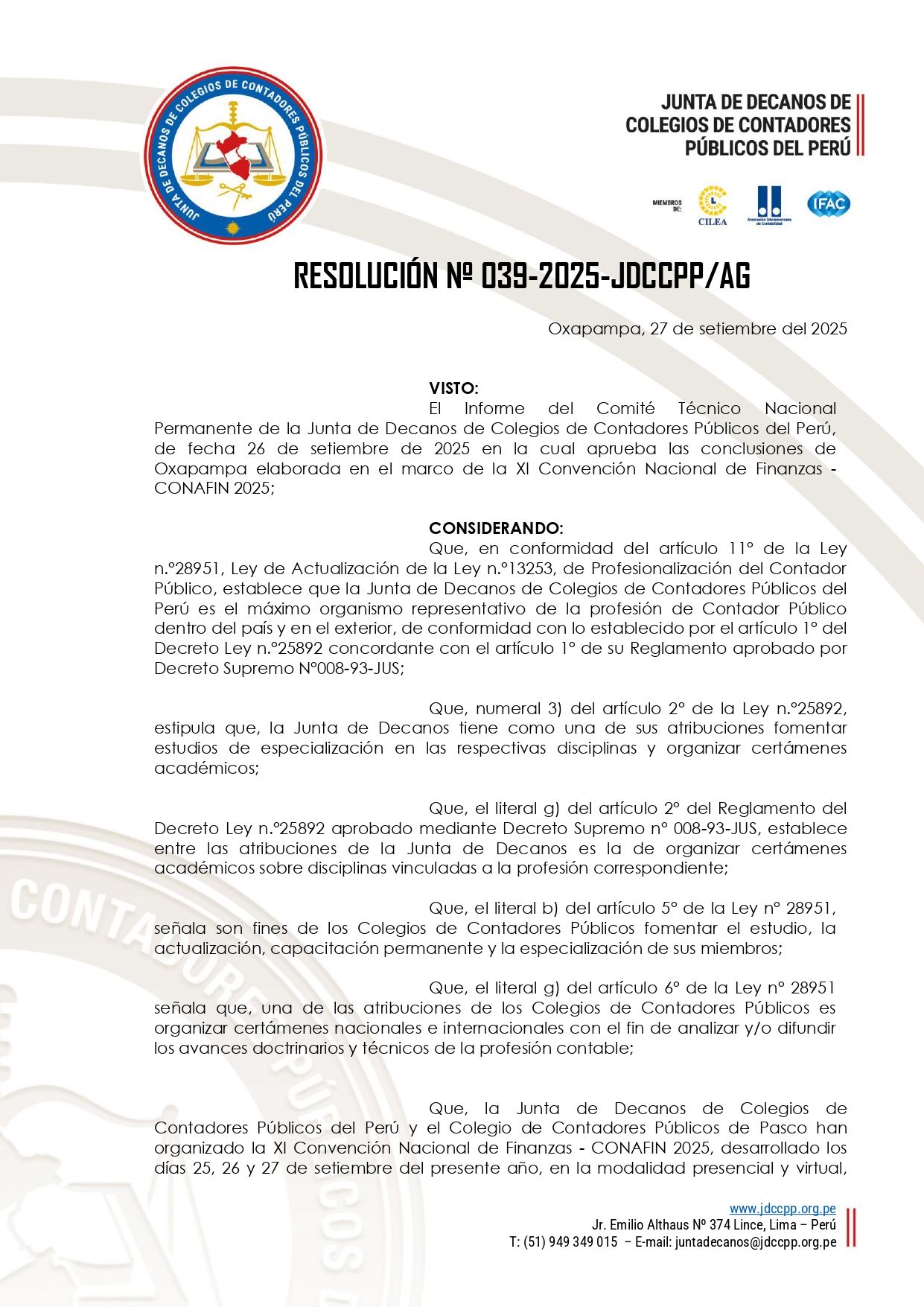 Que, la Junta de Decanos de Colegios de Contadores Públicos del Perú y el Colegio de Contadores Públicos de Pasco han organizado la XI Convención Nacional de Finanzas - CONAFIN 2025, desarrollado los días 25, 26 y 27 de setiembre del presente año, en la modalidad presencial y virtual, evento académico que contribuye a difundir los avances científicos y tecnológicos del ejercicio de la profesión, con miras a ocupar una posición de vanguardia frente a los retos que le plantean los cambios económicos actuales y futuros en el Perú y en el mundo, con una visión innovadora y valores éticos en la profesión del Contador Público, que permita cumplir la misión de ambos en el estudio e investigación de la especialidad de finanzas; así como, a la difusión, mejor conocimiento e intercambio de técnicas de la profesión con otras áreas de conocimiento y el fortalecimiento de las relaciones interinstitucionales;
