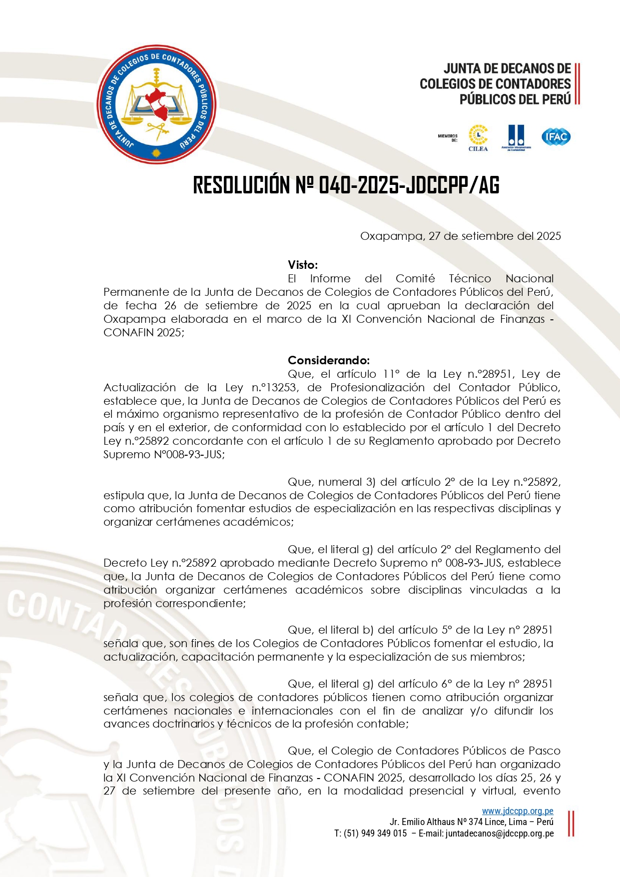 El Informe del Comité Técnico Nacional Permanente de la Junta de Decanos de Colegios de Contadores Públicos del Perú, de fecha 26 de setiembre de 2025 en la cual aprueban la declaración del Oxapampa elaborada en el marco de la XI Convención Nacional de Finanzas - CONAFIN 2025;