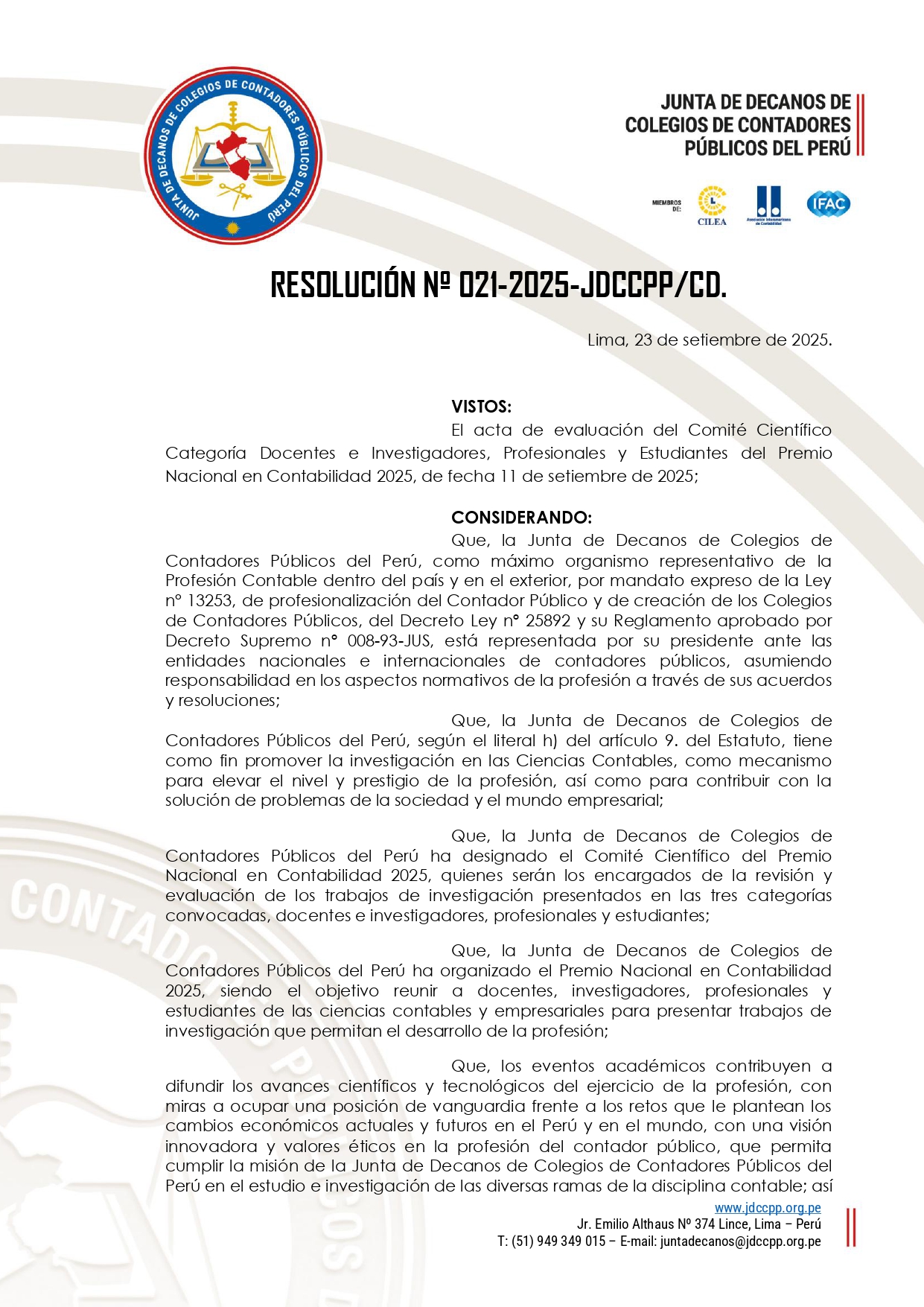 Que, la Junta de Decanos de Colegios de Contadores Públicos del Perú ha organizado el Premio Nacional en Contabilidad 2025, siendo el objetivo reunir a docentes, investigadores, profesionales y estudiantes de las ciencias contables y empresariales para presentar trabajos de investigación que permitan el desarrollo de la profesión;