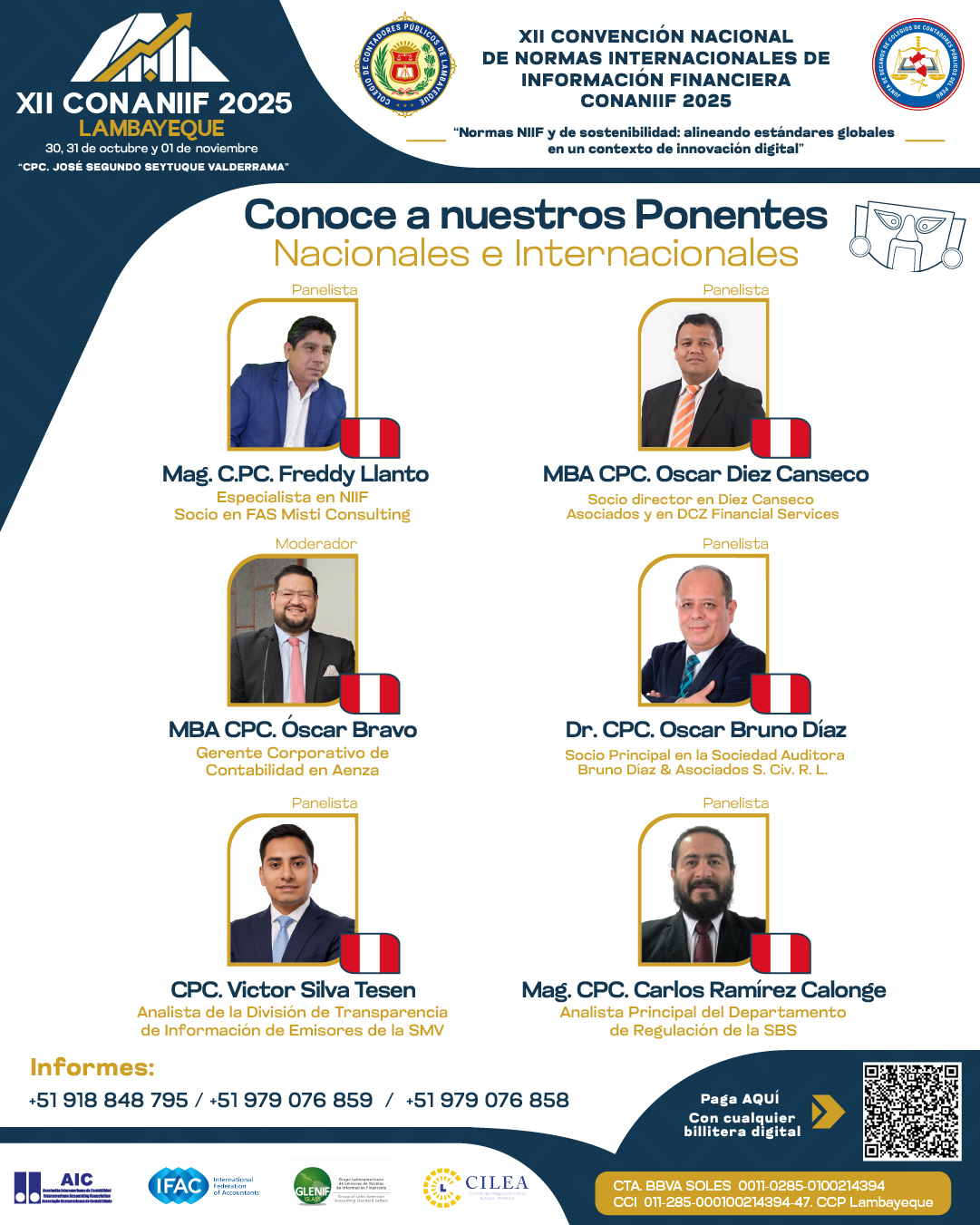 Profesionales destacados del ámbito contable y académico se unen a esta gran convención para liderar los paneles de debate y análisis sobre las Normas NIIF y de sostenibilidad, aportando su experiencia y visión desde distintas especialidades.