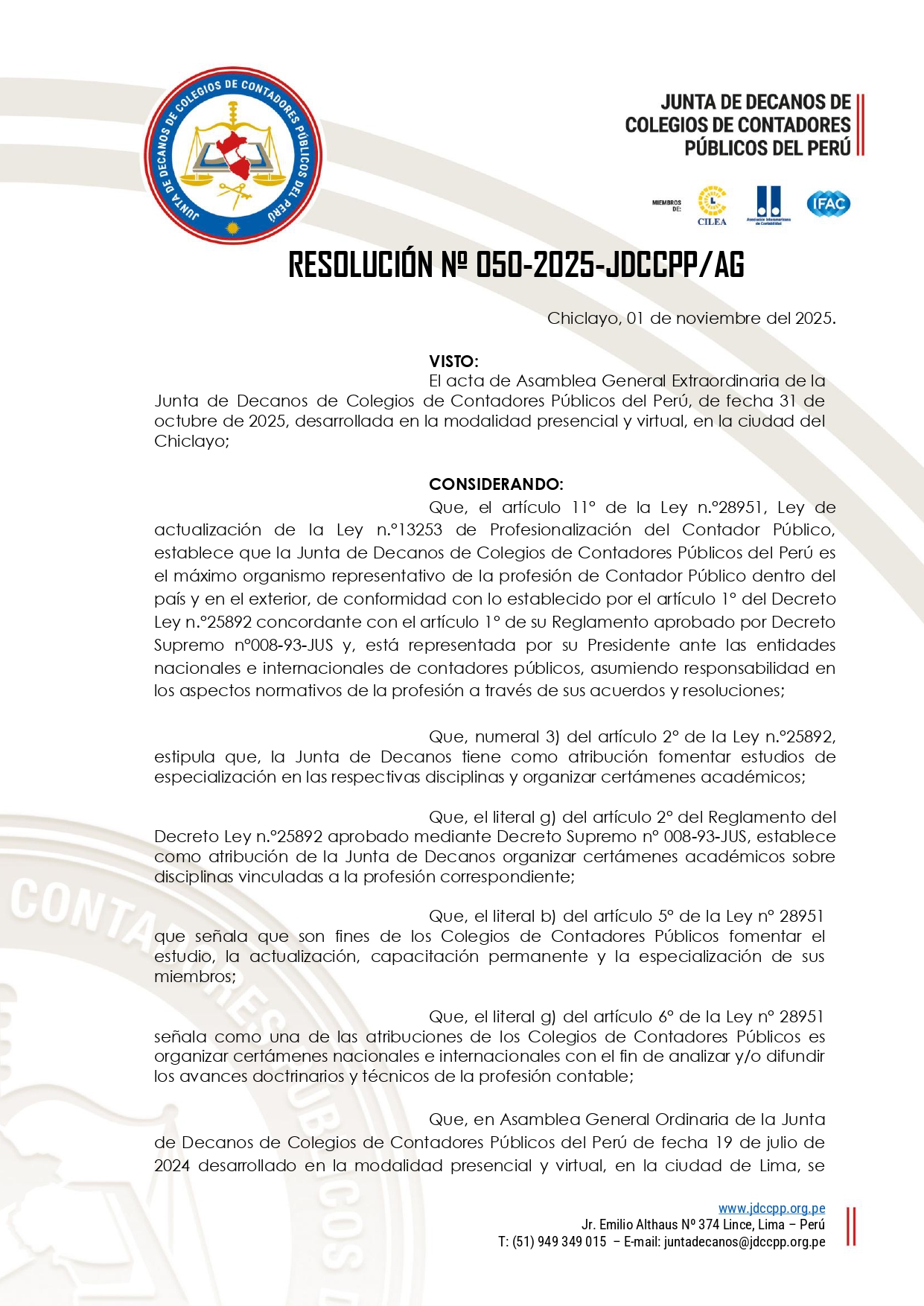 El acta de Asamblea General Extraordinaria de la Junta de Decanos de Colegios de Contadores Públicos del Perú, de fecha 31 de octubre de 2025, desarrollada en la modalidad presencial y virtual, en la ciudad del Chiclayo;