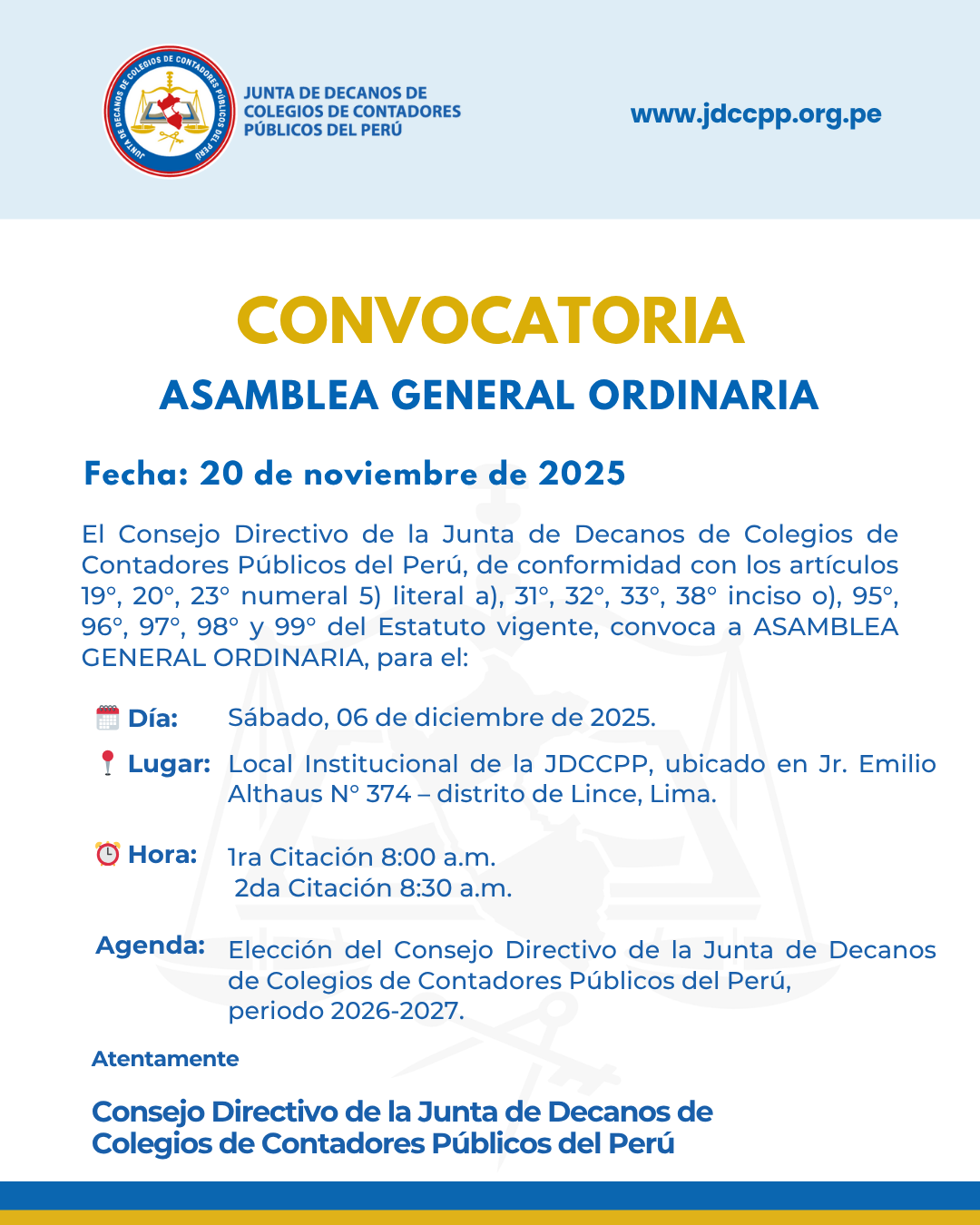 La Junta de Decanos de Colegios de Contadores Públicos del Perú convoca a sus miembros a participar en la Asamblea General Ordinaria, conforme al Estatuto vigente.