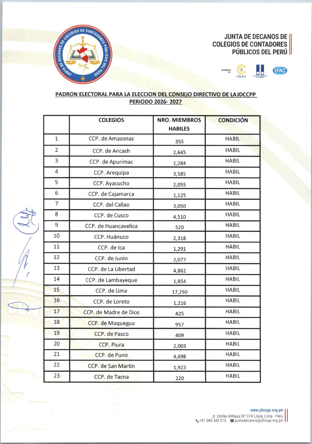 La Junta de Decanos de Colegios de Contadores Públicos del Perú pone a disposición de la comunidad contable el Padrón Electoral oficial, correspondiente al proceso de elección del Consejo Directivo para el periodo 2026–2027.