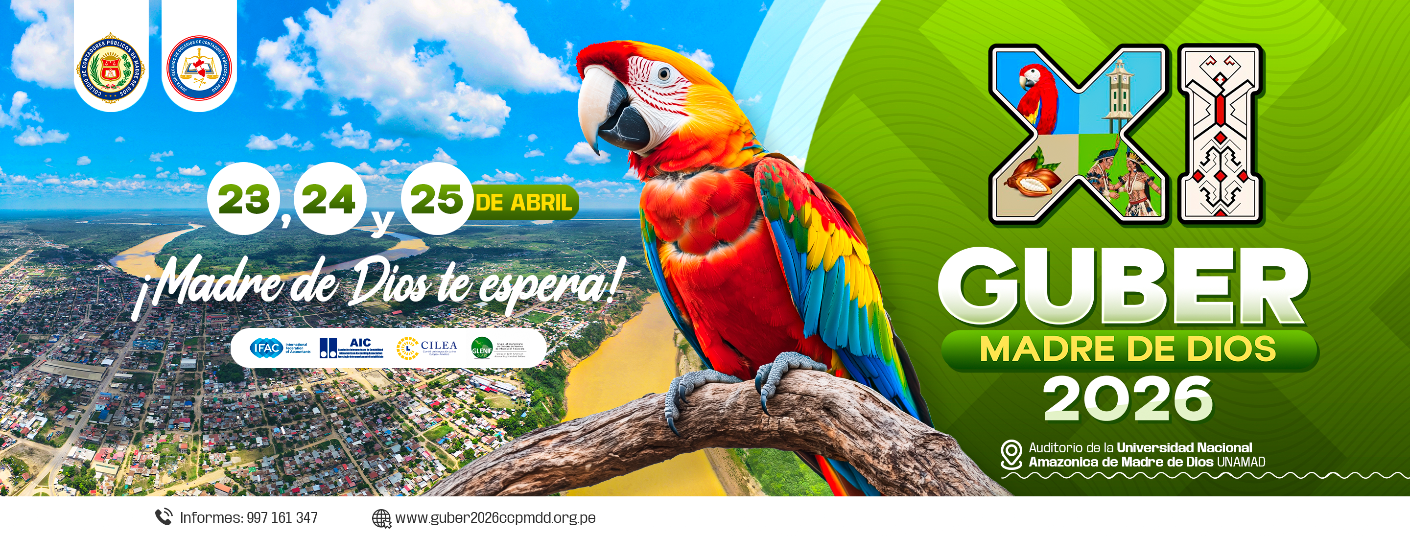 La Junta de Decanos de los Colegios de Contadores Públicos del Perú y el Colegio de Contadores Públicos de Madre de Dios presentan la XI Convención Nacional de Contabilidad Gubernamental y Gestión Pública – GUBER 2026. Este 23, 24 y 25 de abril de 2026.