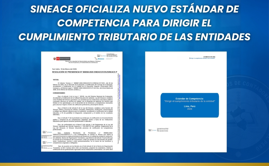 La Junta de Decanos de Colegios de Contadores Públicos del Perú (JDCCPP) informa a la comunidad contable y a la ciudadanía en general que el Consejo Superior del Sistema Nacional de Evaluación, Acreditación y Certificación de la Calidad Educativa (SINEACE) ha oficializado la aprobación del Estándar de Competencia denominado “Dirigir el cumplimiento tributario de la entidad”, mediante Resolución de Presidencia N.° 000058-2026-SINEACE/COSUSINEACE-P, de fecha 18 de marzo de 2026 .