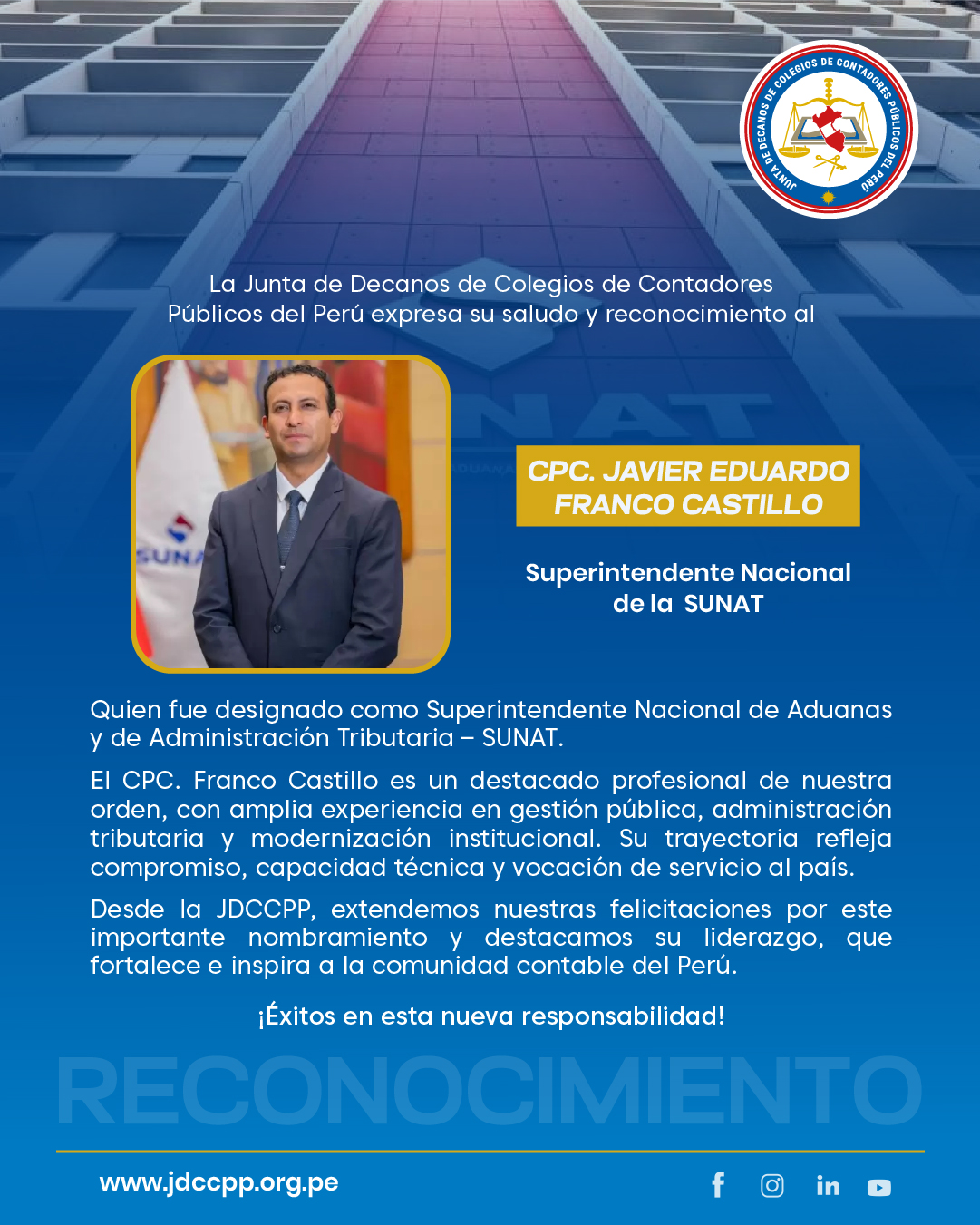 La Junta de Decanos de Colegios de Contadores Públicos del Perú (JDCCPP) felicita al CPC. Javier Eduardo Franco Castillo por su designación como Superintendente Nacional de Aduanas y de Administración Tributaria – SUNAT, asumiendo la conducción de una de las instituciones más importantes para la administración tributaria y aduanera del país.