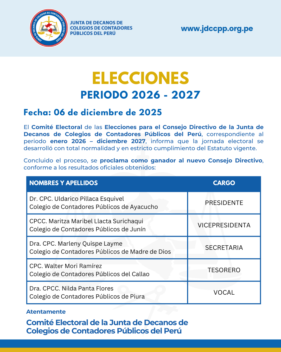 El Comité Electoral de las elecciones para el CONSEJO DIRECTIVO PERIODO ENERO 2026 - DICIEMBRE 2027 de la Junta de Decanos de Colegios de Contadores Públicos del Perú, anuncia oficialmente que la jornada electoral se desarrolló con normalidad el 06 de diciembre de 2025, proclamándose como ganador el Consejo Directivo integrado por: