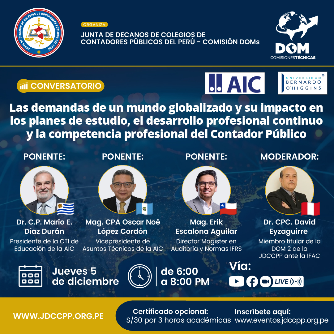 CONFERENCIA: Los planes de estudios de las universidades ante los principales retos de los contadores públicos hacia el 2030 ¡Participa en nuestra próxima Conferencia sobre el futuro de la formación contable! Organizado por la Comisión Especial DOM 1 y DOM 2 d...