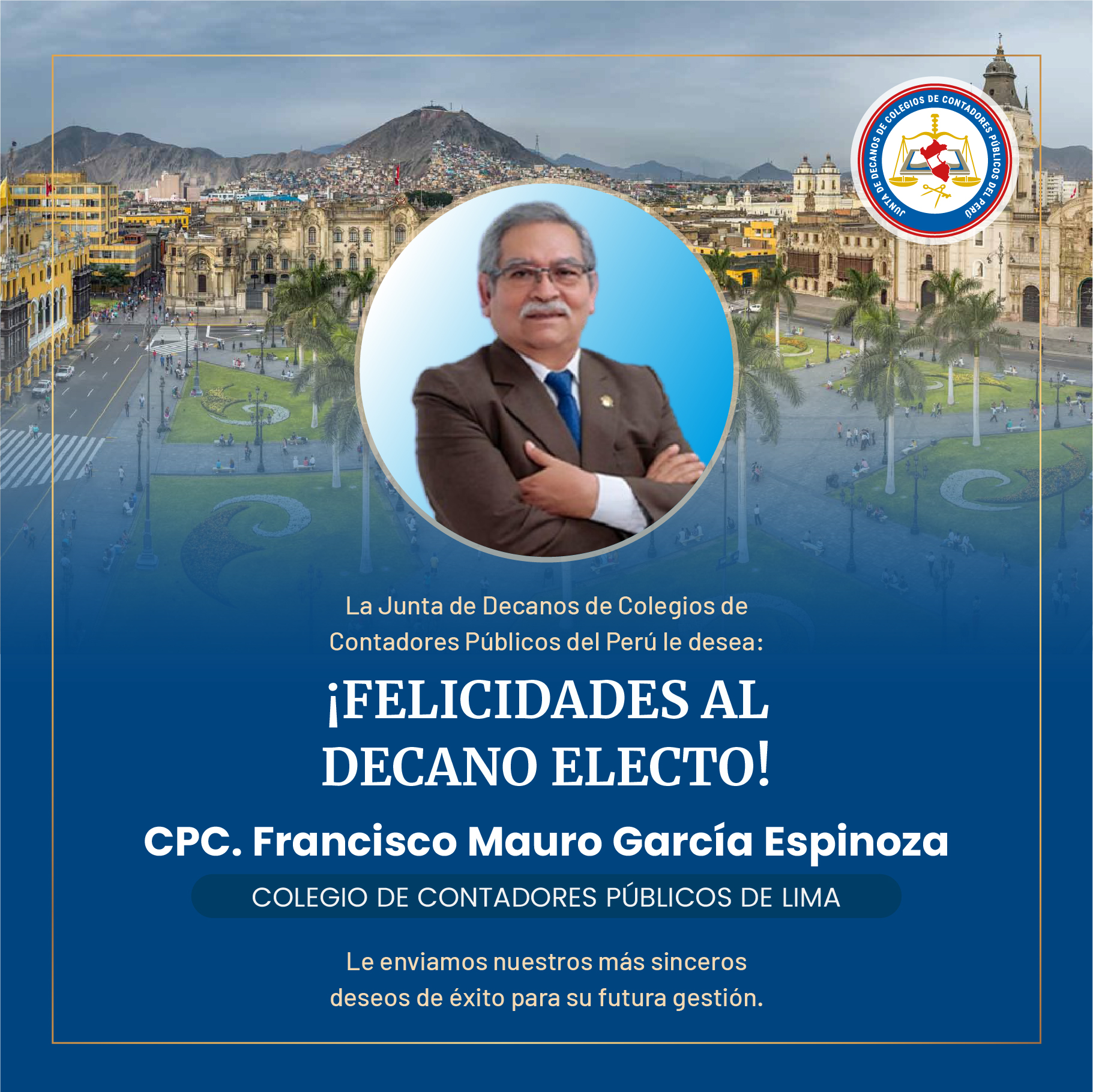 FELICIDADES AL DECANO ELECTO DE LIMA La Junta de Decanos de Colegios de Contadores Públicos del Perú felicita al distinguido decano electo: CPC. Francisco Mauro García Espinoza, decano del Colegio de Contadores Públicos de Lima. Expresamos nuestros mejores deseos par...