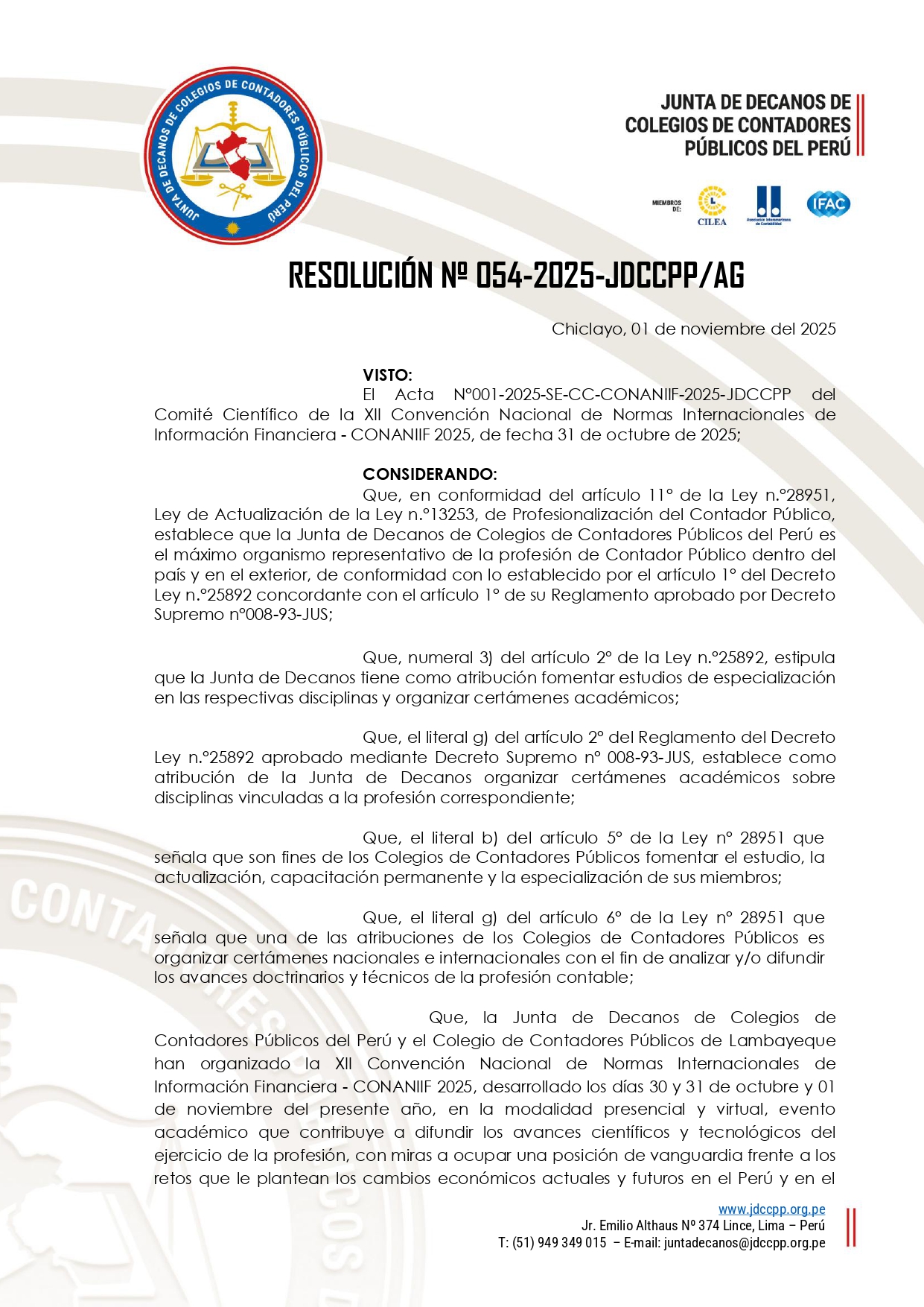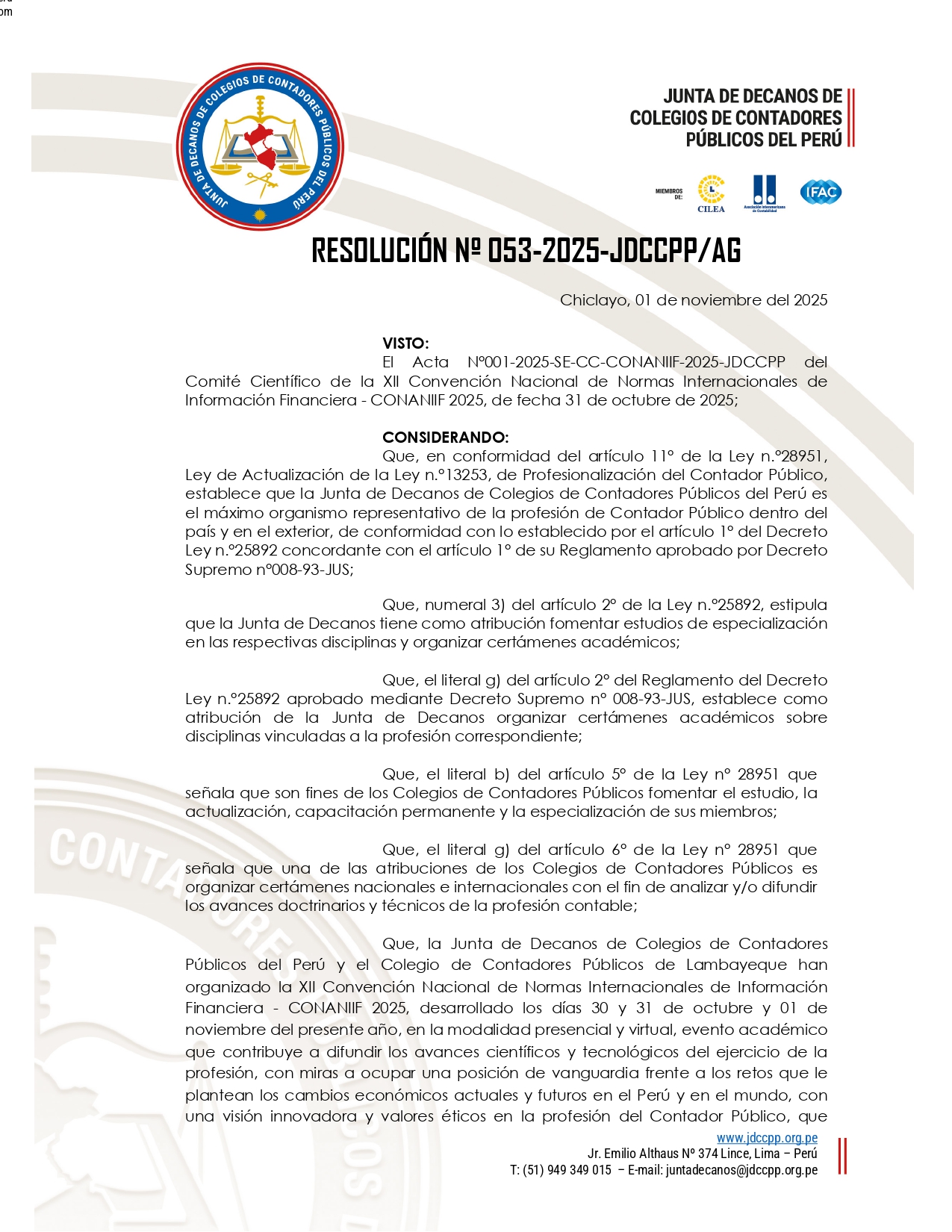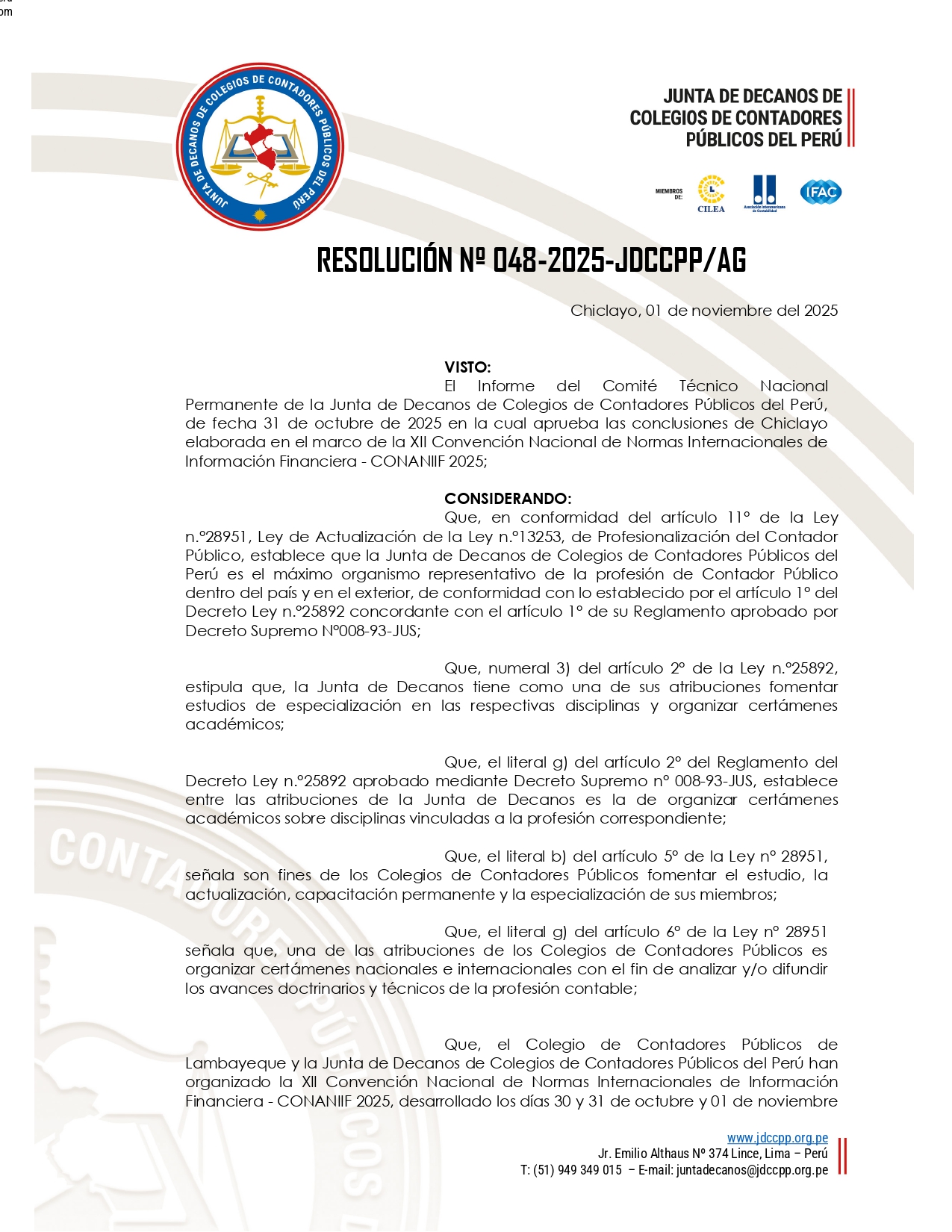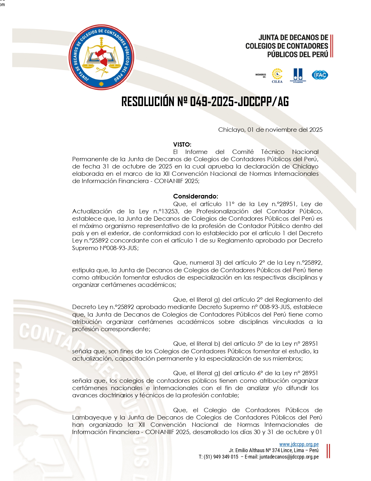 DECLARACIÓN DE CHICLAYO - CONANIIF 2025 RESOLUCIÓN Nº 049-2025-JDCCPP/AG Chiclayo, 01 de noviembre del 2025   VISTO: El Informe del Comité Técnico Nacional Permanente de la Junta de Decanos de Colegios de Contadores Públicos del Perú...