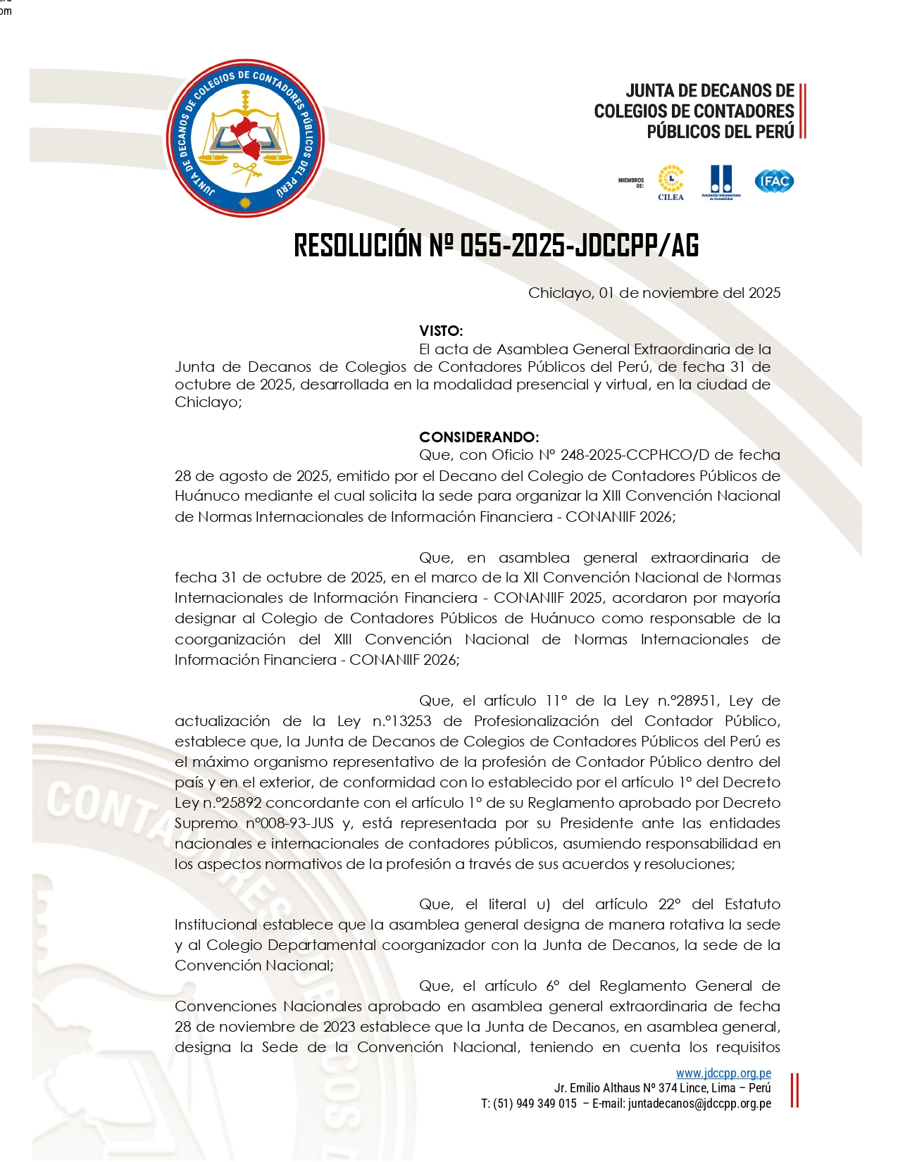Designación de la sede de CONANIIF 2026 RESOLUCIÓN Nº 055-2025-JDCCPP/AG Chiclayo, 01 de noviembre del 2025   VISTO: El acta de Asamblea General Extraordinaria de la Junta de Decanos de Colegios de Contadores Públicos del Perú, de fecha 31 de octu...
